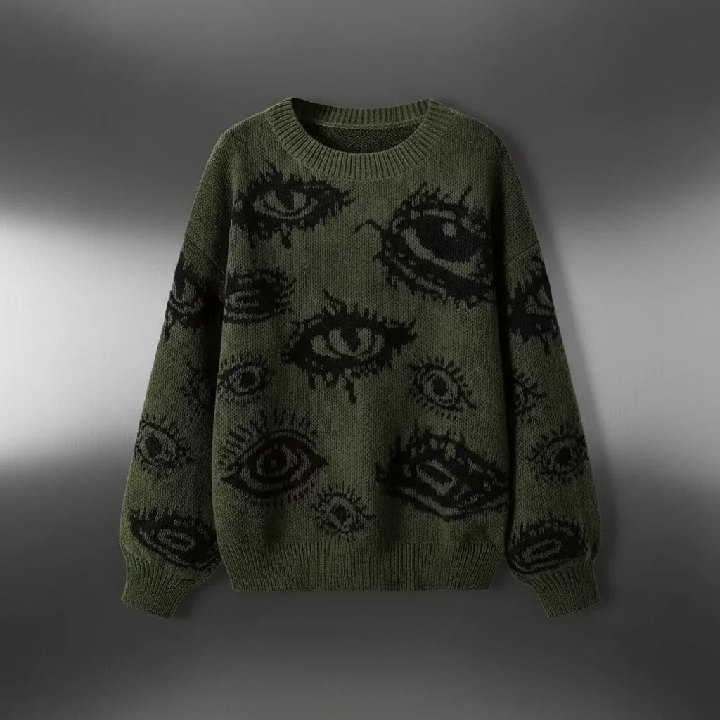 Relaxed-fit knit sweater featuring abstract eye print. Crafted for comfort with a soft, grunge-inspired edge.